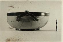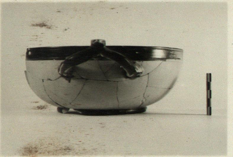 | Description: | About half preserved. Wide low ring foot. Wall curves up to plain unthickened vertical lip marked with broad shallow groove on exterior. Horizontal wish-bone handles. Body inside and out, and base covered with sealing-wax red, now mostly peeled off. Lip, handle, foot and two circles (one wide and one narrow) on base glazed black. | |