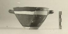 Description:   One handle and much of rim and body missing; restored in plaster. Plain, slightly projecting rim. Body tapers to small flat bottom. Reserved band at line of handles and at bottom of body. Top of rim and bottom also reserved.