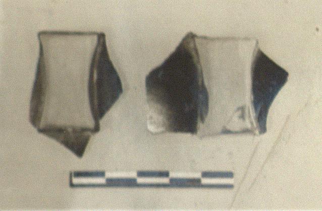 Description:   Only the two handles preserved. Reserved, rectangular handles, the long sides slightly concave. Pierced vertically by a single hole.