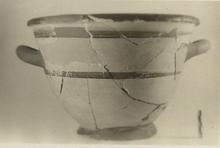 | Description: | Both handles and fragments of rim, body and foot missing; restored in plaster. Glazed torus lip, below which two bands of glaze. Outer face of spreading foot also glazed. Good black glaze on interior. | |
