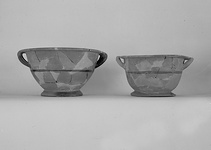 Description:   Fragments missing throughout; restored in plaster. Flat topped, flaring rim to which handles rise and are attached. Single glaze line around body. Outer face of flaring foot glazed. Glaze on interior much worn and pitted.