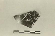 Description:   A fragment from wall of a black glaze skyphos. Neatly incised on exterior: a dancing, ithyphallic satyr; head, shoulders and part of one leg missing. Behind him, part of uncertain object.