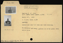 | Description: | Handle and half of body and base missing. On shoulder, garlands painted in brown glaze over white slip. | |