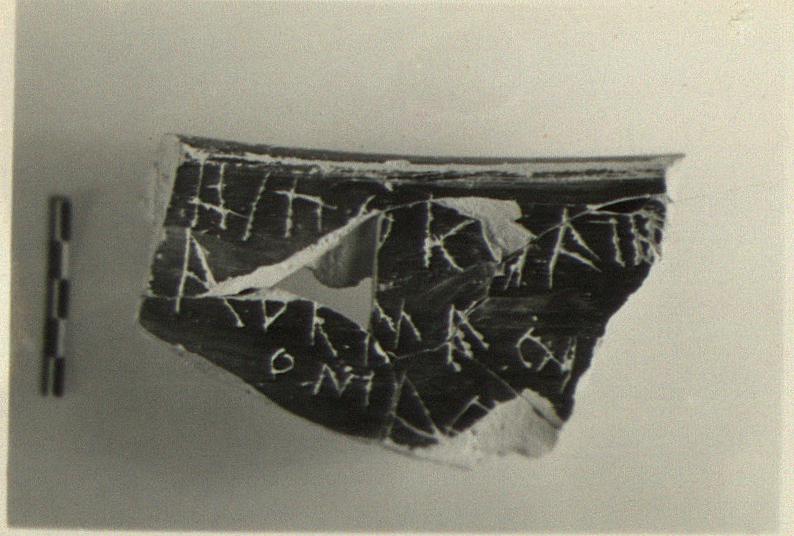 | Description: | From upper wall and rim of a semi-glazed krater; black glaze inside and on rim. Chip missing from inscription which is incised inside: <graphic> | |