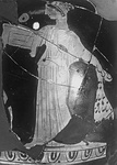 | Description: | Nine joining pieces preserve handle, lower neck, about one-quarter of body and part of foot. Restored in plaster. Tongue pattern at base of neck; egg pattern as ground line. A draped standing woman, right, holding a cloth in her left hand, a basket in her right. Uncertain object in front of her. White for dots, fot fillet and for object over basket. | |