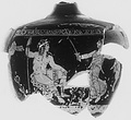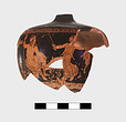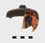| Description: | Two non-joining fragments. a) Most of shoulder and part of upper body, made up from three pieces. Heads of two women right, the front one carrying a large bowl with handle, uncertain object at edge of break. b) Bit of the shoulder and a large part of one side of the body, made up of three pieces. Parts of three figures, from left: front part, head missing, of draped figure, right; seated nude male, with boots and staff, right; dancing maenad, left, draped, sword in one hand, dead animal in the other. Palmette pattern on shoulder and border of egg pattern at its base. Ground line of egg pattern. | |