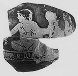 | Description: | Two joining pieces from body of toy oinochoe. Egg pattern ground line. A child seated, facing, head turned left, object resembling mallet (rattle?) in left hand. Dull black glaze, partially fired red; somewhat peeled. Traces of white on hand and object held in it. | |