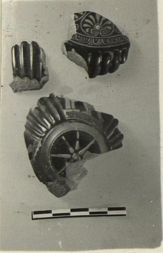 | Description: | Three non-joining fragments of an egg-shaped vase, an aryballos. a) Part of lower body and of bottom. b) Part of shoulder and of ribbing on body. c) Ribbed fragment from body. The body is divided by three vertical ribbed areas into three panels of which the lower parts of two are preserved. In one, a pair of feet; in the second, a pair of feet, left, facing a herm or stele. Palmettes on shoulder, with band of egg pattern around. Thinned clay paint for dots in palmettes and for star on bottom. Very glossy black glaze; clay and reserved red fired gray. | |