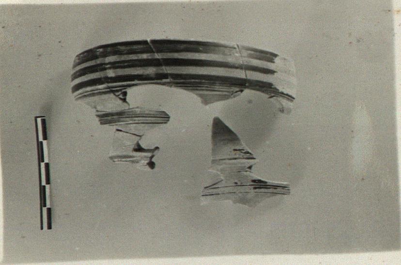 | Description: | Two non-joining fragments of a high dome-shaped lid with plain rim. The rim banded; above, zones separated by glaze bands and grooves; in each zone, eye-shaped holes. Dull black glaze; reserved areas on outside painted with miltos. Inside unglazed. | |