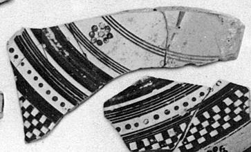 | Description: | Joins P 1695. Possibly from the same pot as P 831. Mended from two fragments. Decorated with rays from the center, a zone of joined dot rosettes and a black band around the edge with applied purple. Paint varies from red to black. Protocorinthian. | |