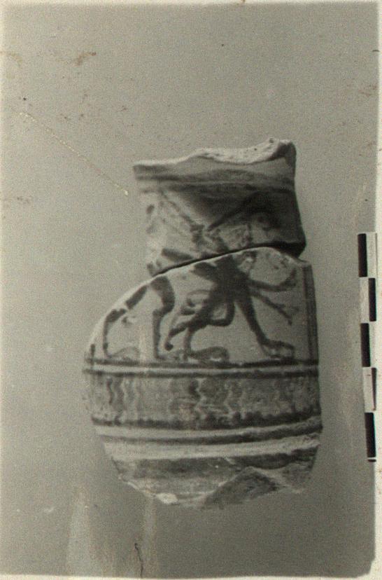 | Description: | Two joining fragments preserve part of oinochoe neck. In a reserved panel at front, a winged sphinx marching right. Face and wings drawn in outline. | |