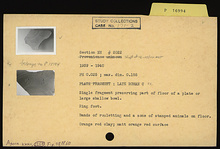 | Description: | Single fragment preserving part of floor of a Late Roman C plate or large shallow bowl. Ring foot. Bands of rouletting and a zone of stamped animals on floor. Orange-red clay; matte orange-red surface. Belongs to P 15184. | |