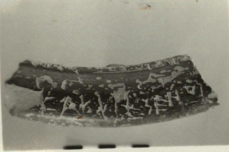 | Description: | Rim fragment of a semi-glazed krater. Incised on upper face of rim: <graphic> | |
