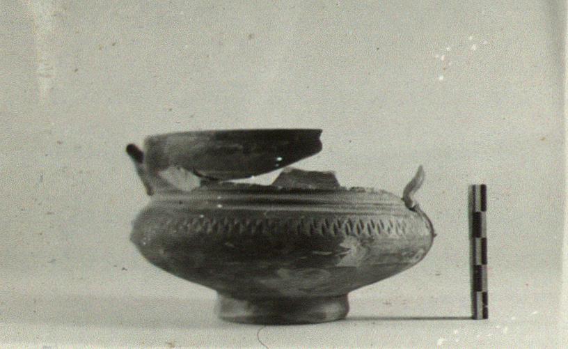 | Description: | Most of rim and both vertical strap handles, except for stumps missing. Ring foot; shallow rounded body; high convex rim. Band of rouletting on shoulder. Gray clay; dull black glaze. | |