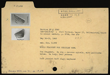 | Description: | Rim fragment. On rim: reverse spirals with guilloche below. On body: leaf pattern. Soft pinkish-buff clay; unglazed. | |