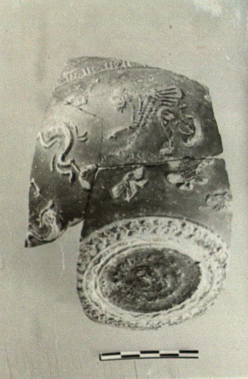 | Description: | Two non-joining fragments, mended from five, preserve bottom, parts of wall and rim. Restored in plaster. Bottom: gorgoneion surrounded by relief mouldings. Body: pegasoi, seated female double flute players, birds, dolphins and sea monsters. Maeander below rim and a scraped groove below slightly projecting lip. Glaze dull black to reddish-brown. | |