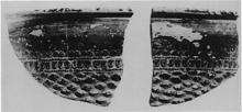 | Description: | Two non-joining rim fragments. Body: irregularly shaped lozenges. Below rim: egg pattern and double scrolls with palmettes. Scraped groove below slightly projecting lip, with traces of miltos. Black glaze, somewhat peeled. | |