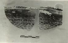 | Description: | Two non-joining rim fragments. Body: irregularly shaped lozenges. Below rim: egg pattern and double scrolls with palmettes. Scraped groove below slightly projecting lip, with traces of miltos. Black glaze, somewhat peeled. | |