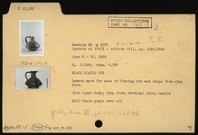 | Description: | Intact save for most of flaring rim and chips from ring foot. Wide squat body; ring foot; vertical strap handle. Dull black glaze over all. Cf. Olynthus V, pl. 171, no. 806. | |