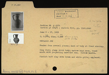 | Description: | Mended from several pieces; much of body at front missing. Ring foot; plump ovoid body; narrow high neck, round mouth with projecting undercut rim. Rolled handle. Pinkish-buff clay with brown and white grits; unglazed. | |