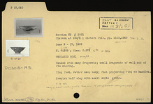 | Description: | Mended from many fragments; small fragments of wall and of rim missing. Ring foot, rather deep body; flat projecting rim; no handles. Grayish-buff clay with small white grits. | |
