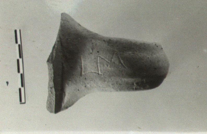 | Description: | Handle and part of neck of a small unglazed pot, a jug or amphora. Incised on top of handle. Dark pink to gray clay with white grits, cinnamon on surface. | |