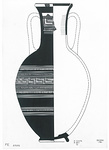 | Description: | Both handles, most of neck and rim missing; restored in plaster. Flaring ring foot; ovoid body, slightly concave neck, rounded lip. At point of greatest diameter a zone of maeander, flanked above and below by triple bands, zigzag, bands, tooth pattern and more bands. Half way between this zone and foot, a zone of tooth pattern with double bands above and below. The rest of body and foot solidly glazed. On neck, reserved panels front and back, containing: maeander, with bands above and below, and zones with alternating standing and hanging teeth with dots between. Reserved band at lip, decorated with vertical lines interrupted by butterflies. Pinkish-buff clay; good black glaze, in places somewhat metallic and peeled. | |