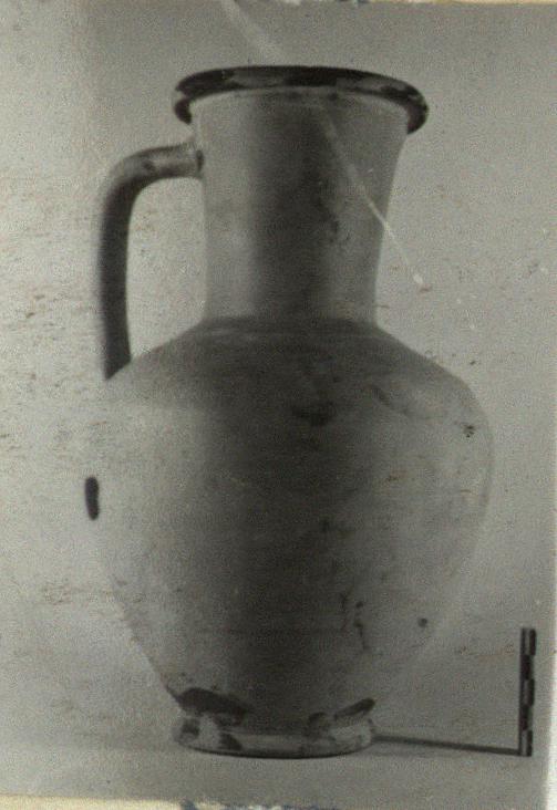 | Description: | Complete and intact save for small hole in one side. Ring foot; ovoid body; straight neck; rounded lip with a raised ring just below it; vertical band handle, triangular in section. Very light raised band at base of neck. Pinkish-buff Attic clay. Unglazed outside except for lip and a few drops of glaze near foot; inside glazed. For fabric cf. P 10439. | |