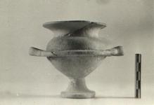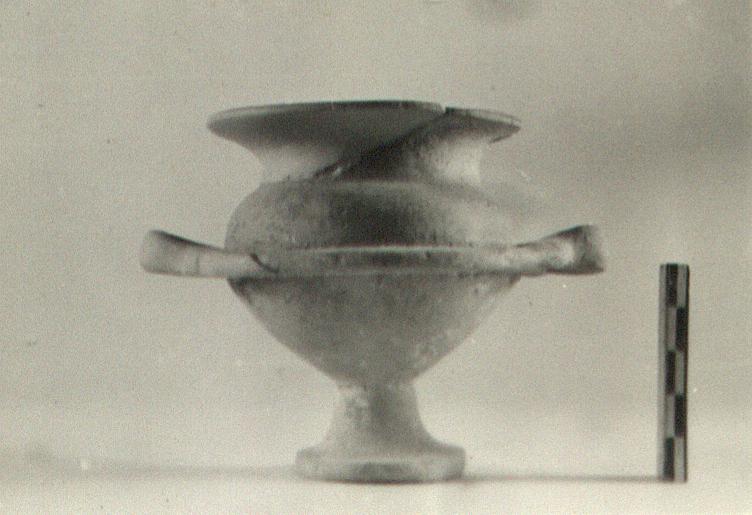 | Description: | One handle and fragments of lip missing; restored in plaster. Deep krater-like bowl on high stand with two horizontal handles; hole in flange on either side of each handle. Buff clay, traces of white engobe. | |