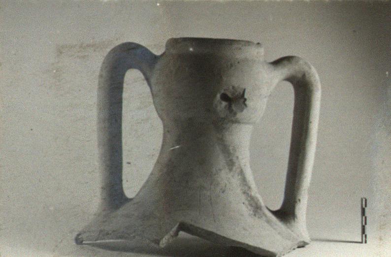 | Description: | Neck and handles preserved. Rounded lip; convex bulge in neck at line of upper handle attachment. On neck, dipinto in red: Λ Graffito below: <graphic> Pinkish-buff clay, buff at surface. | |