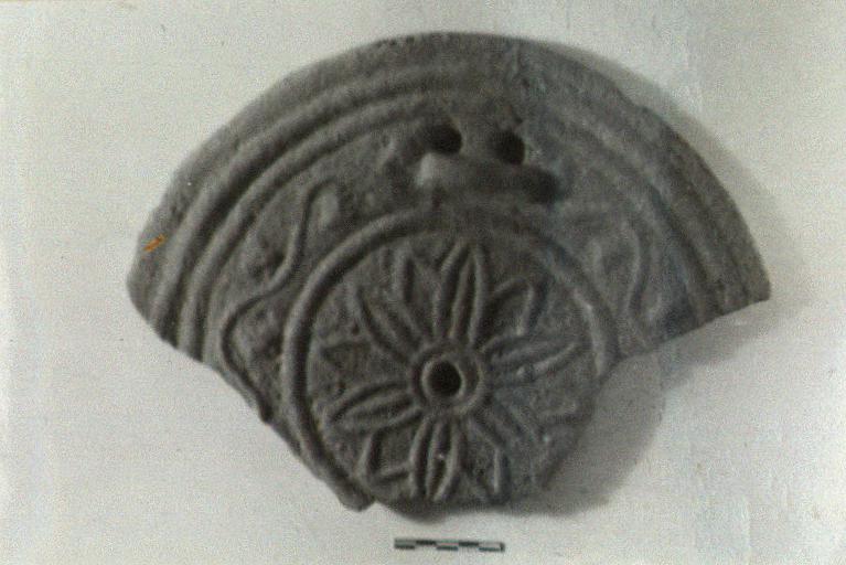 | Description: | Nearly half of a round disk preserved. Bottom plain. Top moulded in relief: petalled flower around a central hole, and ivy leaf pattern outside. Lifting lug with two holes beside it near rim. Coarse pinkish clay with red and white grits. Cf. P 11911. Cf. Agora XXXIII, no. 374. | |