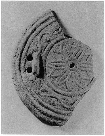 | Description: | Nearly half of a round disk preserved. Bottom plain. Top moulded in relief: petalled flower around a central hole, and ivy leaf pattern outside. Lifting lug with two holes beside it near rim. Coarse pinkish clay with red and white grits. Cf. P 11911. Cf. Agora XXXIII, no. 374. | |