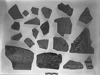 | Description: | Fragment from upper part and incurving rim. Handle with projecting ends. Decorated with bands and running dog on the handle. Paint purplish-red. Not glazed inside. The handle with tips like horns is very common at this period. Early Orientalizing(?) style. | |