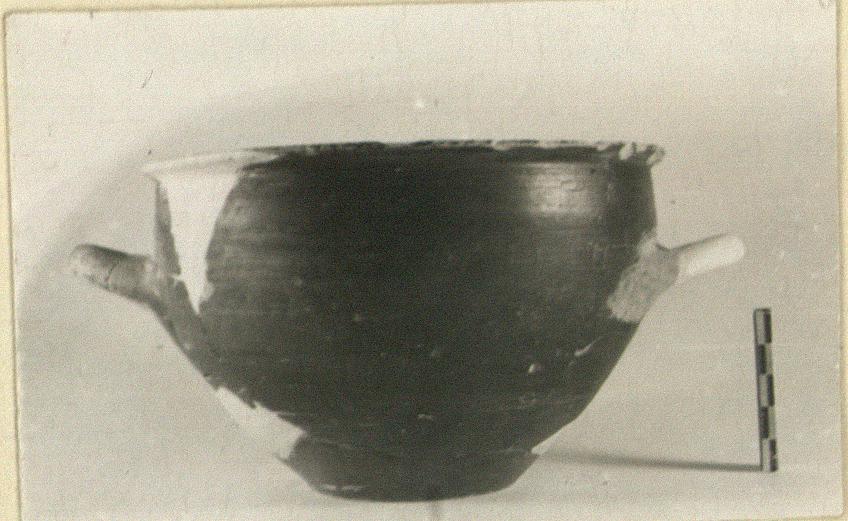 | Description: | One handle and much of one side restored in plaster. Flat bottom; rounded body; sharply offset lip. Black to reddish glaze overall except for resting surface, a reserved line on upper face of lip and reserved band halfway up the wall inside. | |
