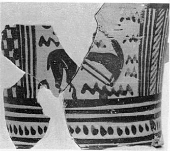 | Description: | From a pitcher with rounded lower body and high straight-walled upper body; part of upper body and plain rim preserved; partially restored in plaster. Vertical strut at back to handle, which is missing. Dots on upper face of lip; glaze bands below, inside and out; upper body divided into panels; in the one panel that is preserved, a deer with head turned back; to the sides, verticals, a column of diagonals and a panel of checkerboard; below the panel zone, bands and a row of dots. Pinkish-buff clay. Black to dark brown glaze. | |
