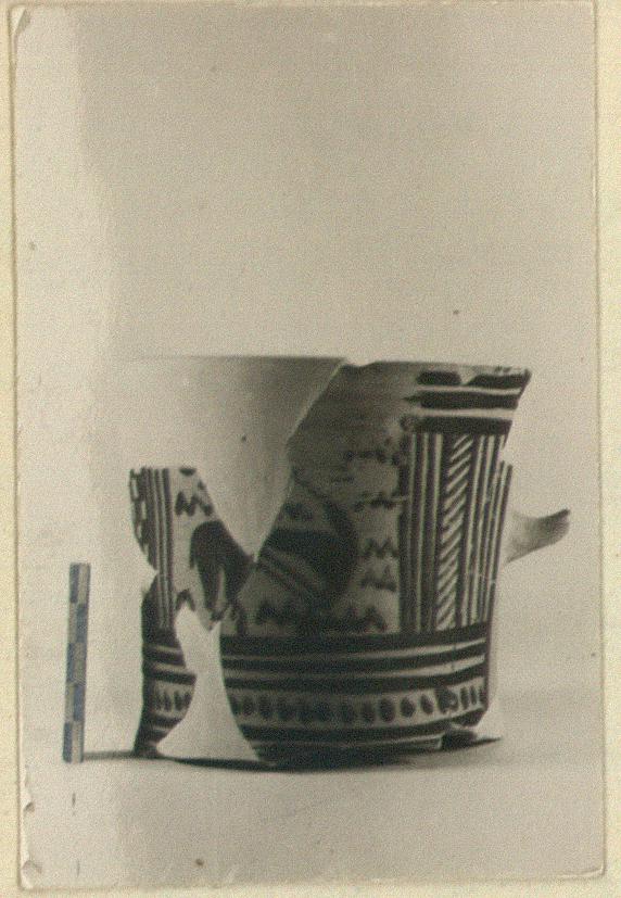 | Description: | From a pitcher with rounded lower body and high straight-walled upper body; part of upper body and plain rim preserved; partially restored in plaster. Vertical strut at back to handle, which is missing. Dots on upper face of lip; glaze bands below, inside and out; upper body divided into panels; in the one panel that is preserved, a deer with head turned back; to the sides, verticals, a column of diagonals and a panel of checkerboard; below the panel zone, bands and a row of dots. Pinkish-buff clay. Black to dark brown glaze. | |