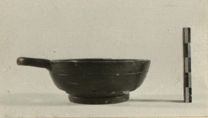 | Description: | Small fragments of body missing. Ring foot; handle at level of plain rim; three grooves around wall. Black glaze over all. | |