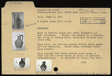 | Description: | Most of trefoil mouth and small fragments of body restored; broken and mended in antiquity; two clamp or string holes preserved in neck, just below rim. Ring foot, too low for convex bottom, which makes pot sit unevenly; ovoid body; straight neck; band handle. Foot glazed; two bands around lower body; a wide and two narrow bands at point of greatest circumference. On shoulder at front, two sets of compass-drawn concentric circles, solid at the middle; tails hanging from band around base of neck to each side. The mouth was glazed. St. Andrew's cross on handle; glazed ring around its lower attachment. Inner edge of mouth glazed. Buff to grayish clay. Dull black glaze, much peeled. | |