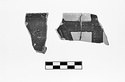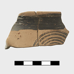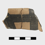 | Description: | Fragment from the slightly flaring rim with part of the handle attachment. Rim glazed; concentric circles in handle zone. Inside decorated with crossed vertical and horizontal wide bands of glaze. Buff clay. Dull black glaze. | |