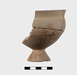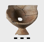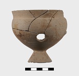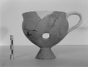 Description:   The handle and about half the body restored in plaster. Conical base; rounded body; rim slightly inset; one vertical band handle. Round hole cut through body (after firing?) at about level of lower handle attachment.