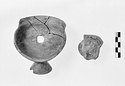 Soft buff to gray clay. Thin black glaze, much worn, inside only.