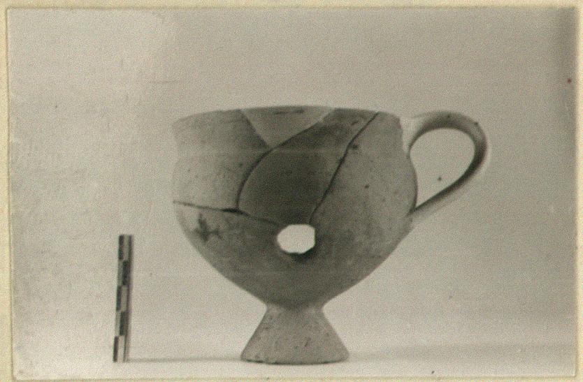 | Description: | The handle and about half the body restored in plaster. Conical base; rounded body; rim slightly inset; one vertical band handle. Round hole cut through body (after firing?) at about level of lower handle attachment. Soft buff to gray clay. Thin black glaze, much worn, inside only. ADDENDA All plaster removed. | |