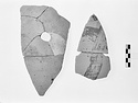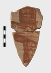| Description: | Triangular fragment from the side wall of a closed(?) pot. Crossed vertical and horizontal bands of glaze inside and out. At one edge the glaze runs over the break, showing that it was added after the pot was broken. Buff clay. Dull red glaze. | |
