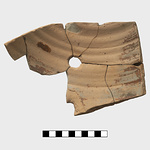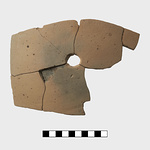 Description:   Possibly from the same pot as P 17261 (ΩΔ 283). Soft gray-buff clay, much worn, with traces of a glaze band outside. Thin dull brown glaze inside. Near the middle, a round hole, its edges neatly bevelled inside and out.