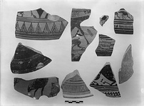 Description:   Fragment from convex lid of large vase; mended from two pieces. Part of opening preserved. Possibly a bowl, with opening for insertion of a spoon(?).