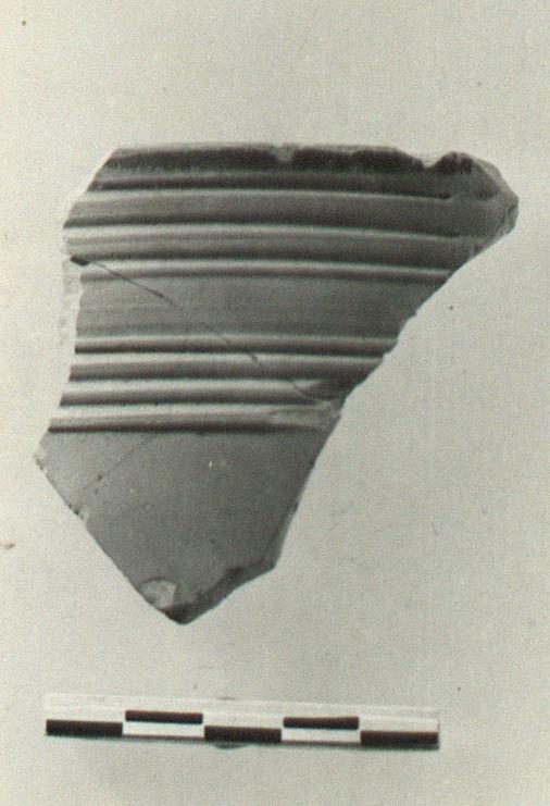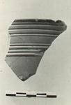 | Description: | Rim and upper wall fragment. At one edge, traces of handle attachment inside, projecting slightly on the outside. Three grooves below the rim outside, then a plain band, below which four careful raised rings with grooves between. Outside unglazed, except for upper edge of rim; good black glaze over inside. | |