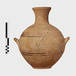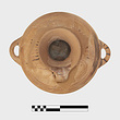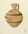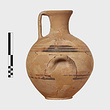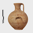 Description:   Restored in plaster: body fragments, and most of mouth. Low base and plump round body; two rolled horizontal and one vertical band handle, shoulder to rim. Raised ridge below junction of body and neck. Decoration in dull black glaze, mostly peeled: two bands below the handles, three above; one at the base of the neck, and a band inside the lip. In the shoulder zone, two spirals at the front, one to each side of the handle at the back; multiple hanging tails between at each side. A wavy line down the outer face of the vertical handle; bands on the horizontal handles, and tails hanging from their attachments.