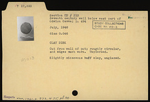 | Description: | Cut from wall of pot. Roughly circular; edges much worn. Unpierced. Slightly micaceous buff clay. Unglazed. | |