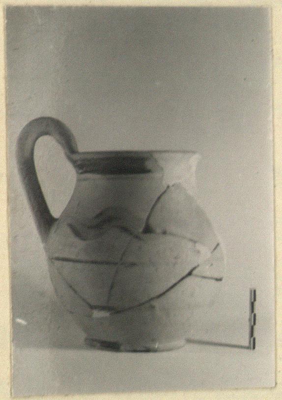 | Description: | Much of rim and body restored in plaster. Low flaring ring base and squat rounded body, curving continuously to plain round mouth; rolled vertical handle rising from rim. Glaze on foot and rim; narrow bands below rim, at the point of greatest diameter and two bands halfway to the foot; vertical bands beside handle panel; wavy band on shoulder. Buff Attic clay. Dull black glaze. | |