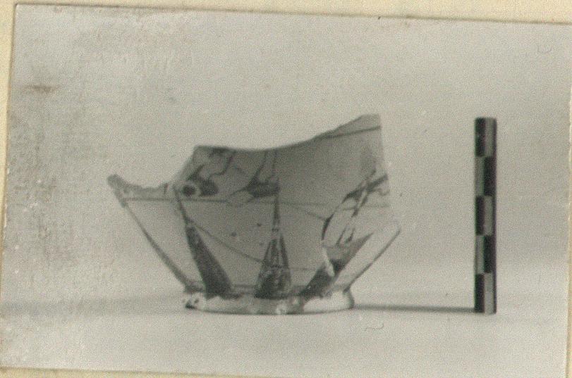 | Description: | Ring foot and part of lower body preserved. Inside the foot, glaze rings covered with purple; on the wall above the foot, rays covered with purple. Above the rays, a single ground line; on it, three hooves and lower legs (of a horse?). Corinthian clay. Dull red glaze, much peeled. Fragments of four more Corinthian skyphoi with rays in tray. Cf. Hesperia 30 (1961), p. 374, noted under no. H 80. | |